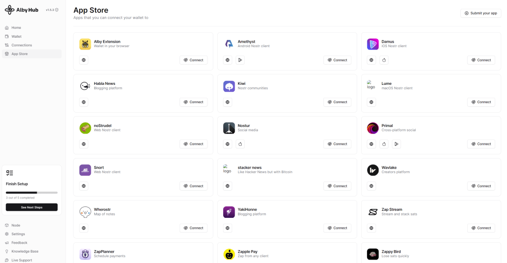 Once logged in, you will be presented with 5 steps for getting started with Alby Hub: