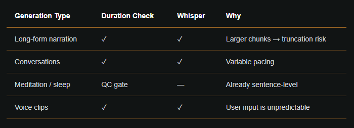 We kept the duration check (it’s free and instant), and added Whisper as a second layer.
